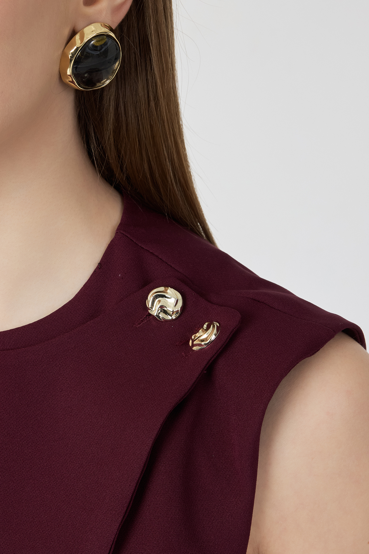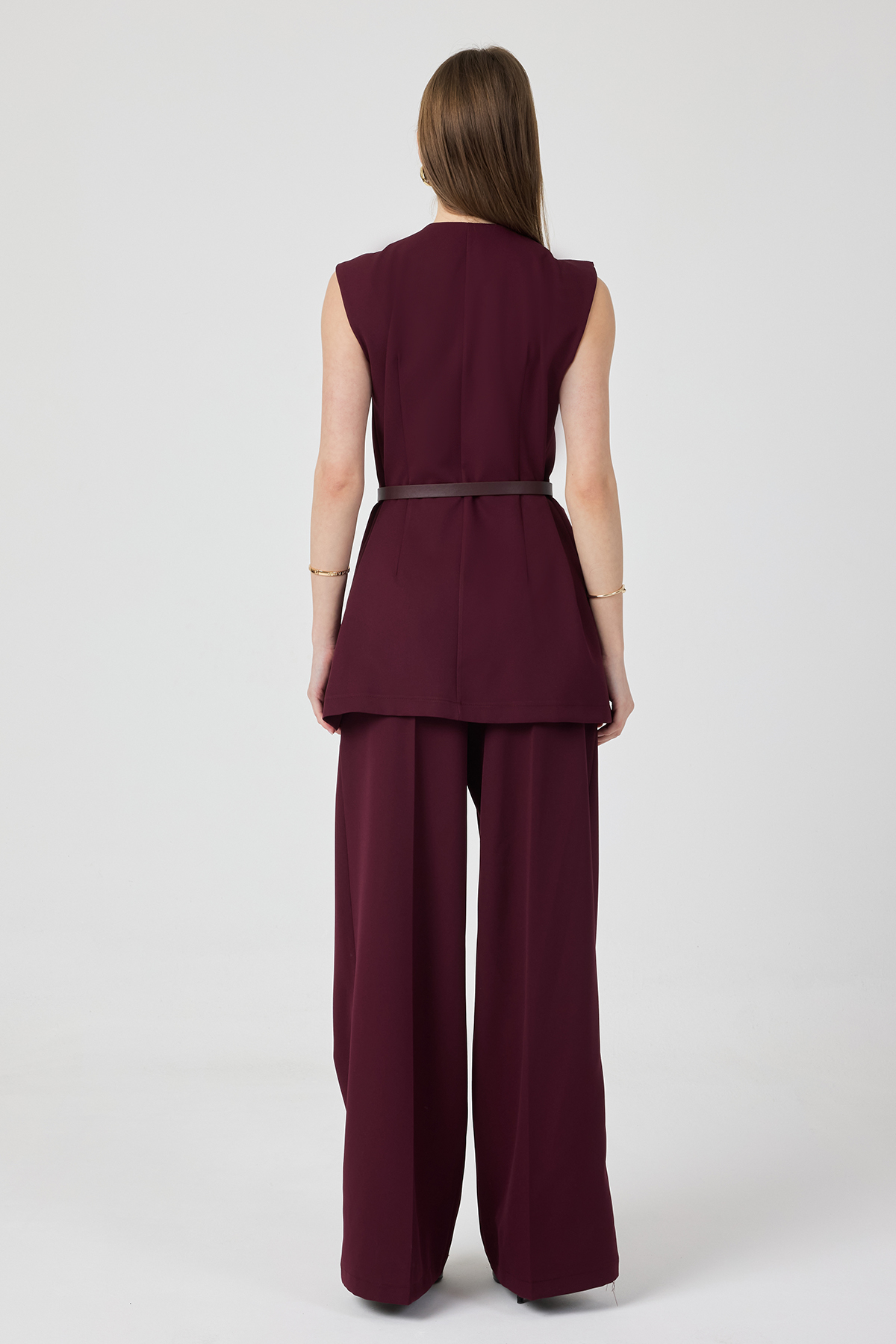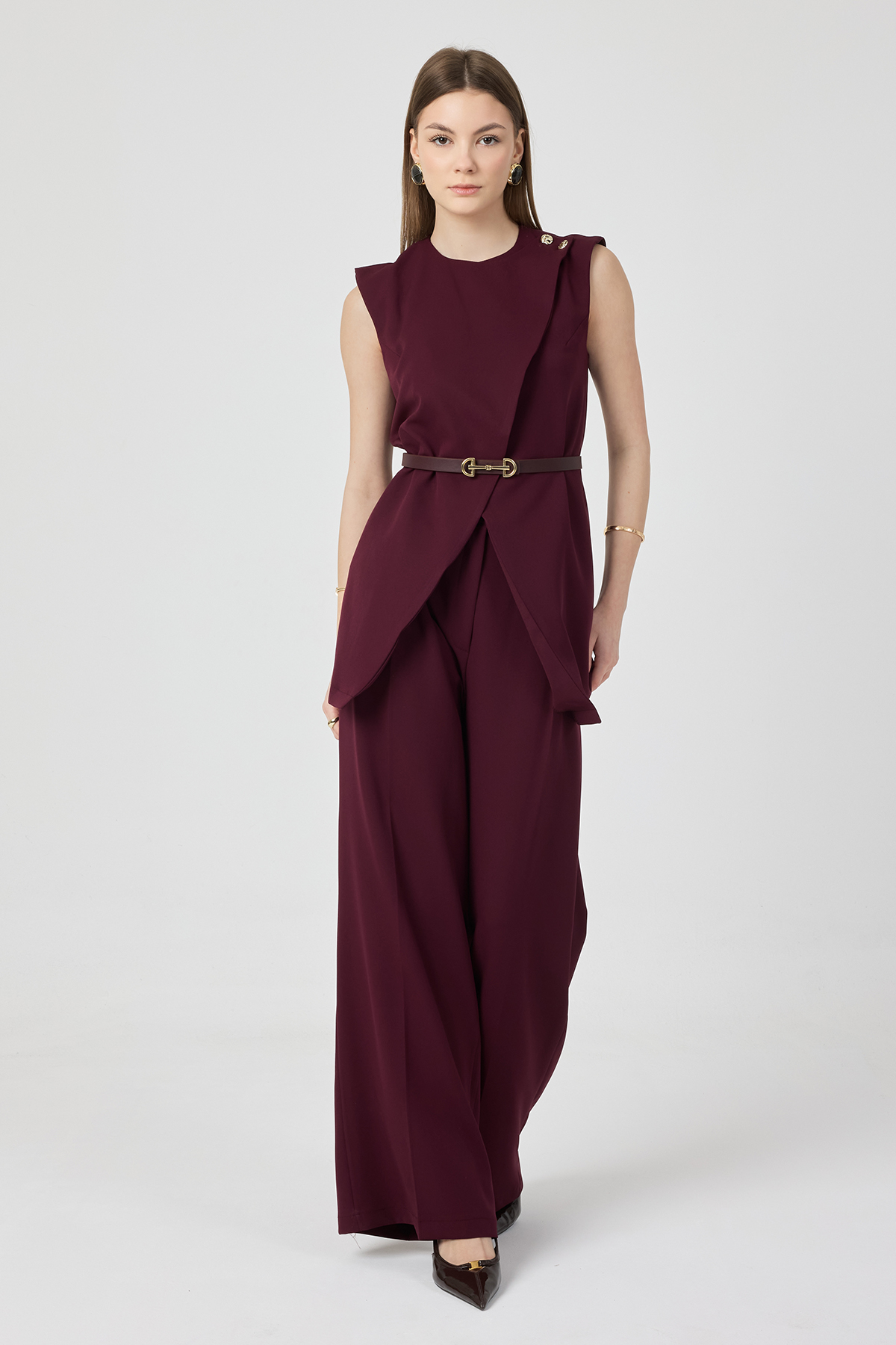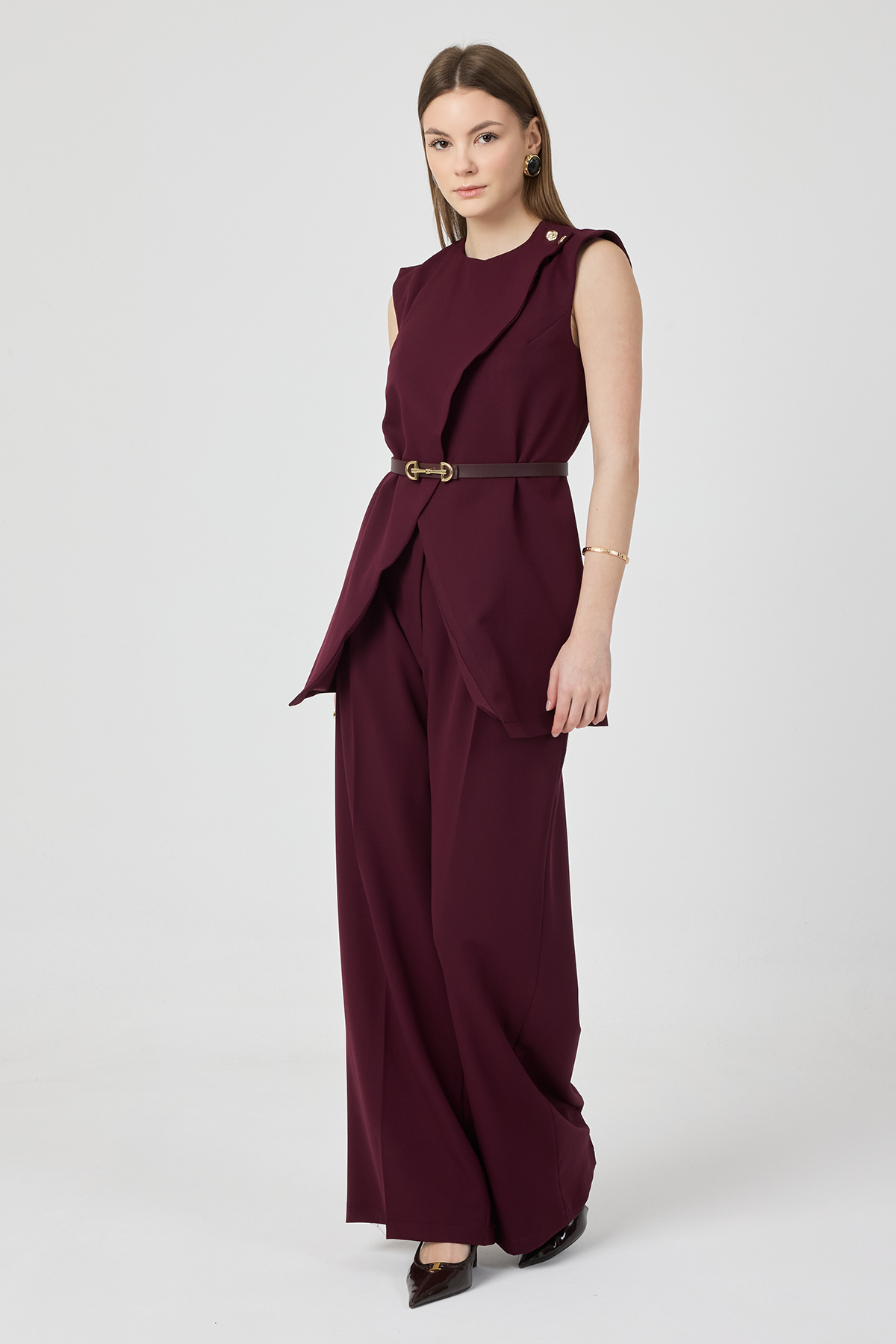 Dökümlü ve hafif kumaşı sayesinde gün boyu konfor sunan yelekli takım, vücuda yapışmayan yapısıyla rahat bir kullanım sağlar. Asimetrik kesim yelek formu ile modern bir duruş sunan model, palazzo kesim pantolonu ve yan cepleriyle kullanım kolaylığı sağlar.