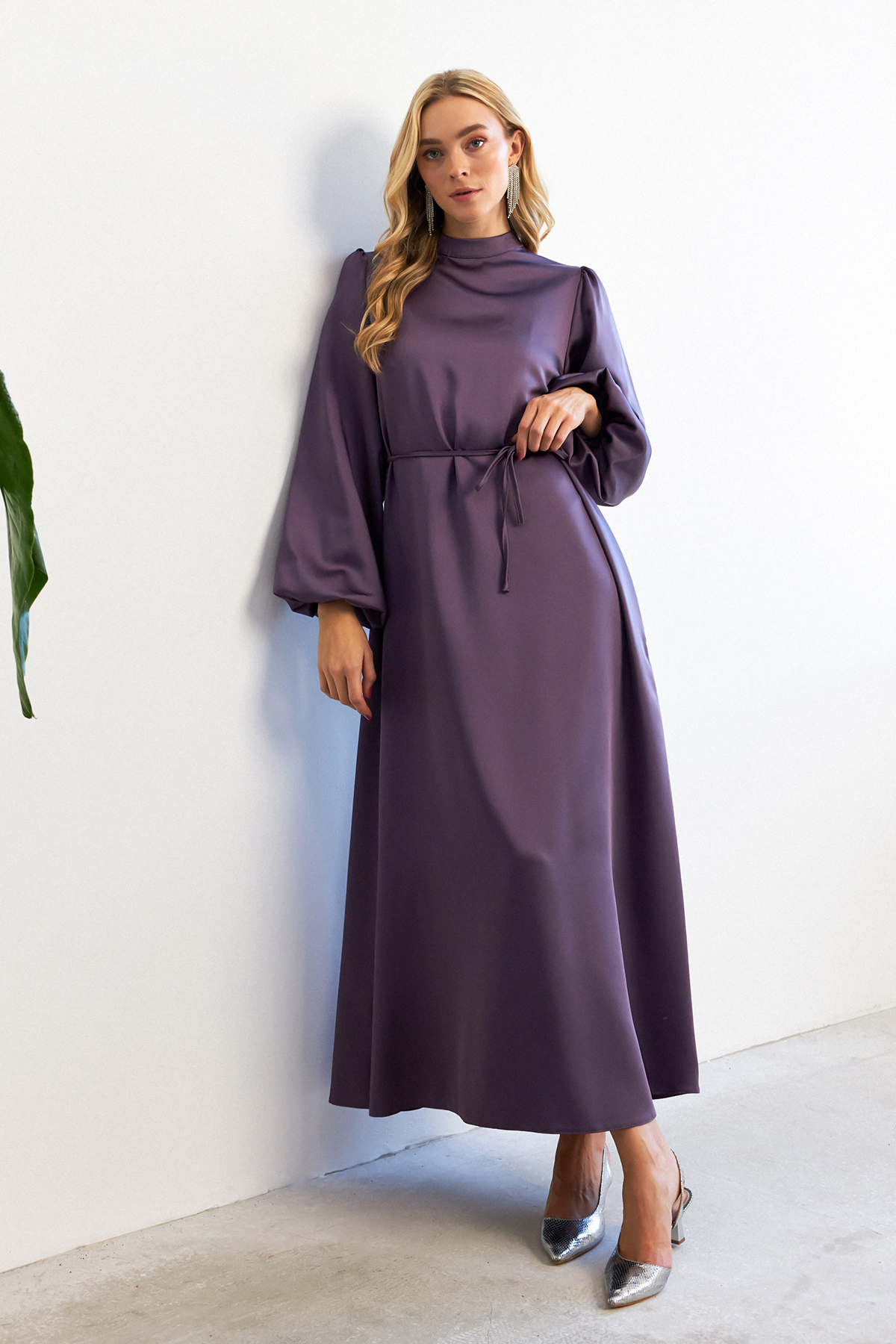 Balon Kol Saten Abiye Elbise - Gül Kurusu