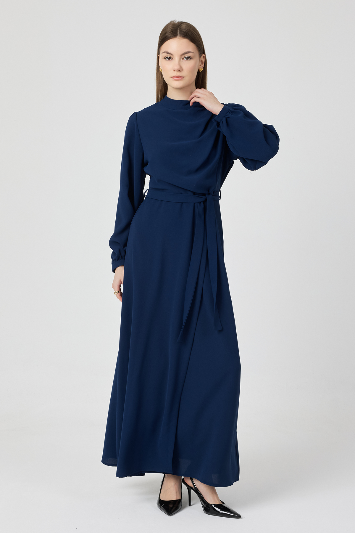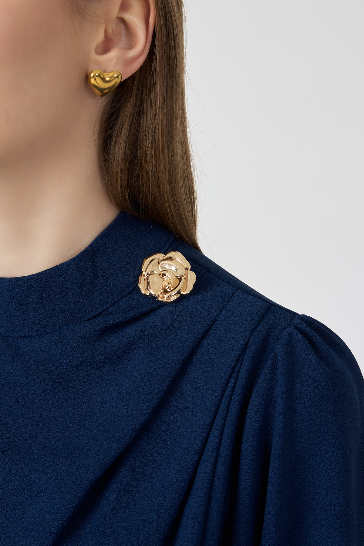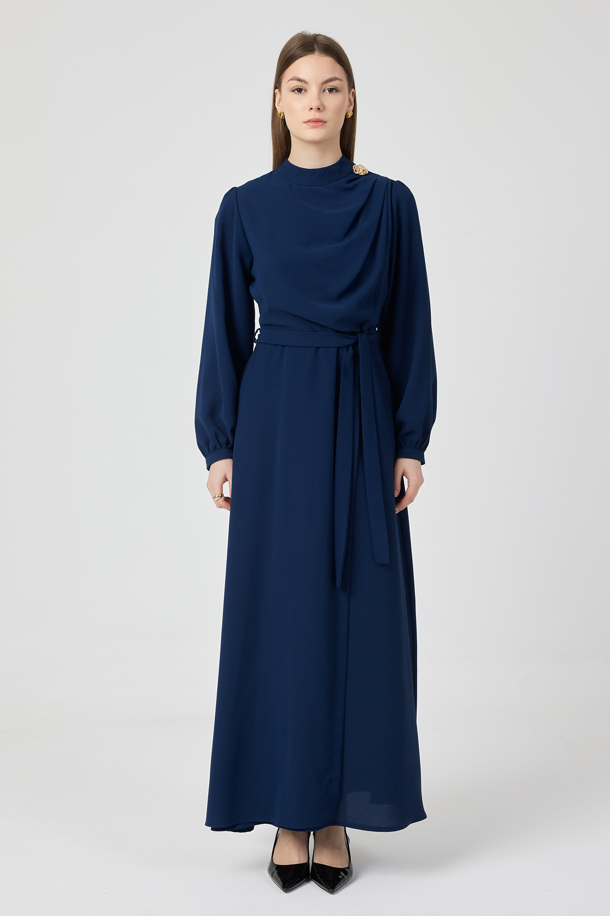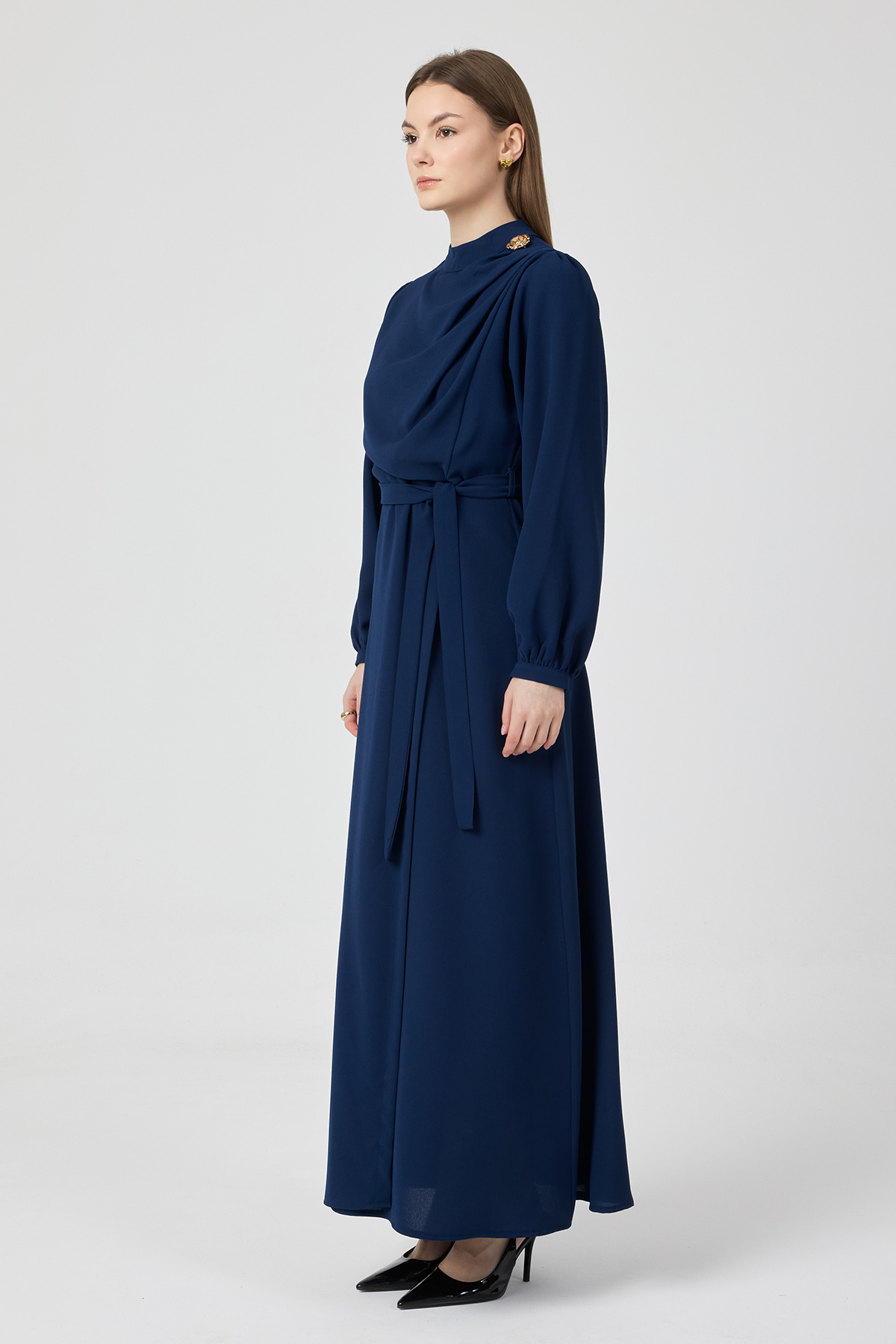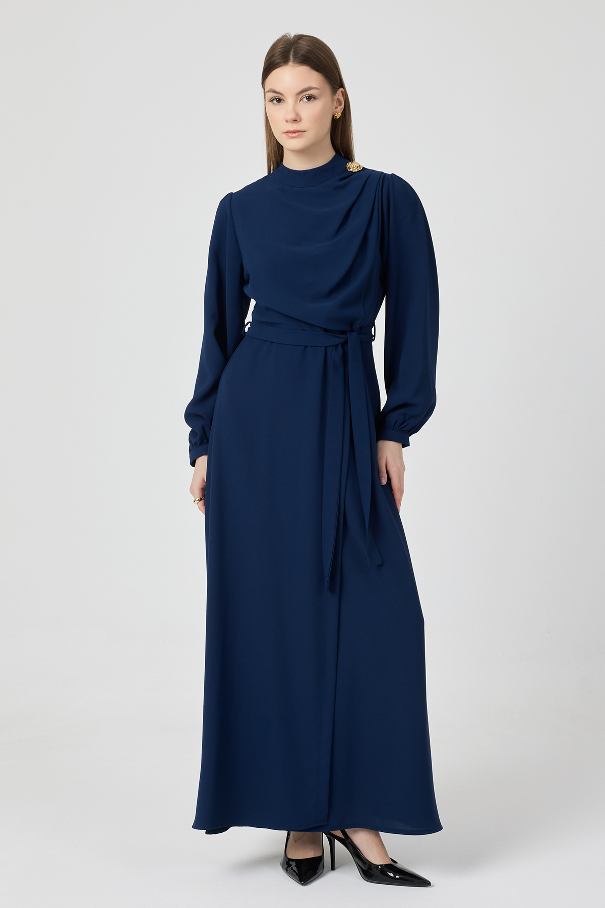 Ön kısmındaki drape detayı ve etek bölümündeki kapak formu ile hareket kazanan model, omuzdaki broş aksesuarıyla şık bir görünüm sunar.