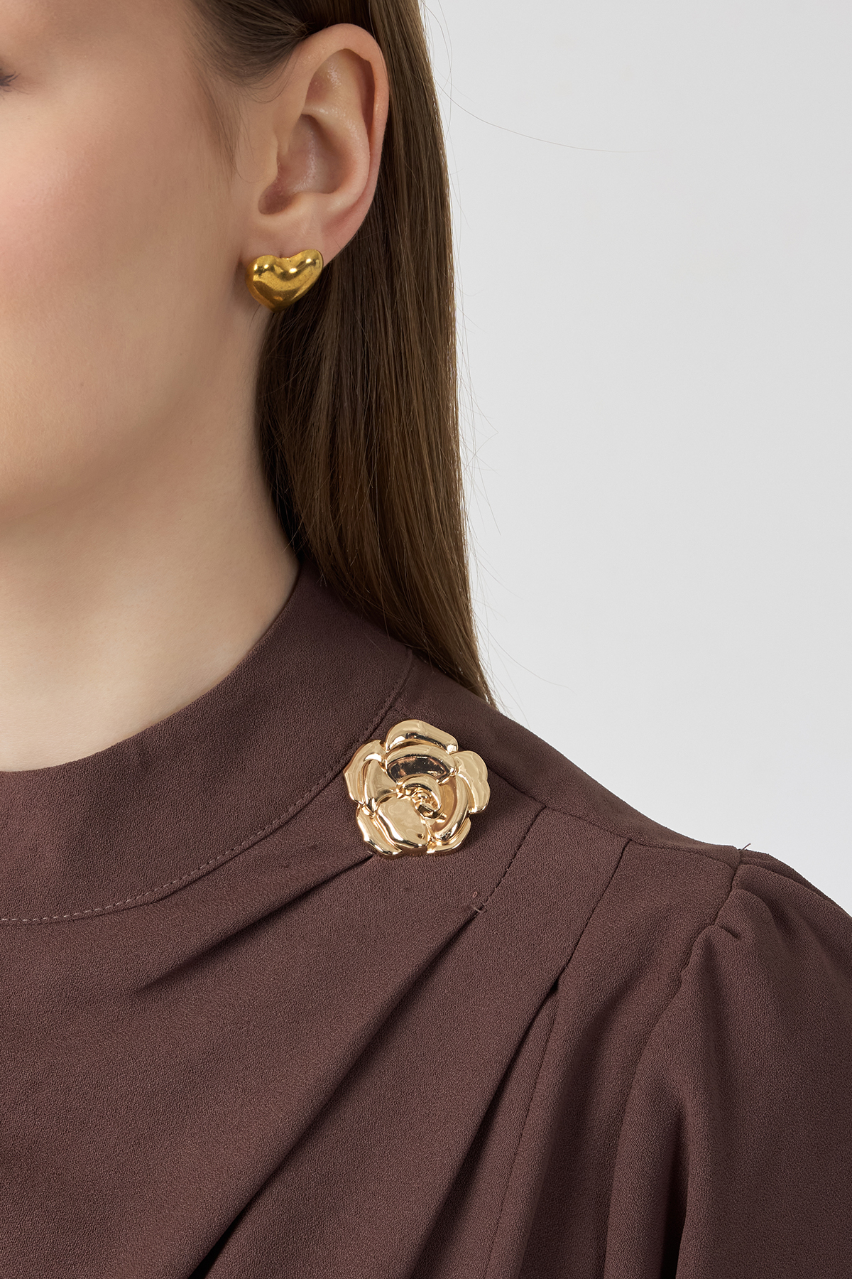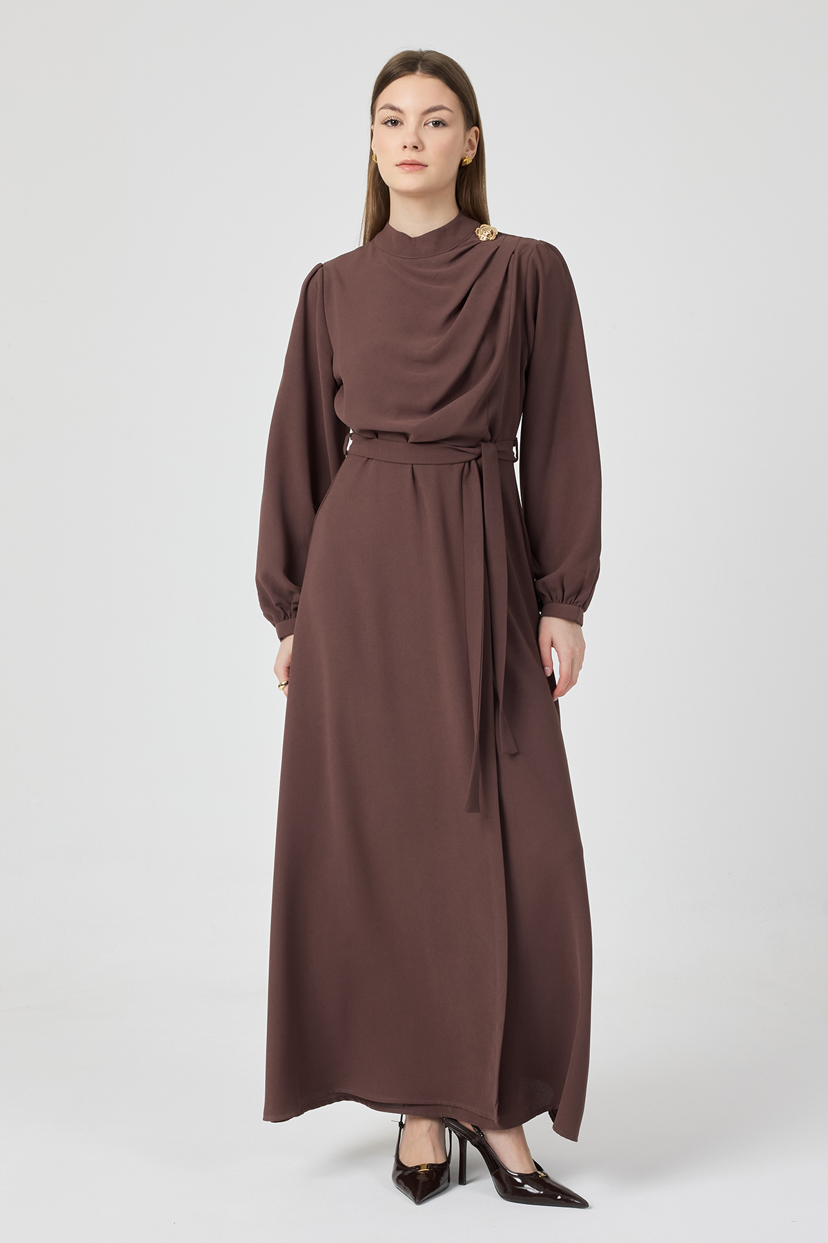 This model, which gains movement with its draped detail at the front and flap shape at the skirt section, offers an elegant look with the brooch accessory on the shoulder.