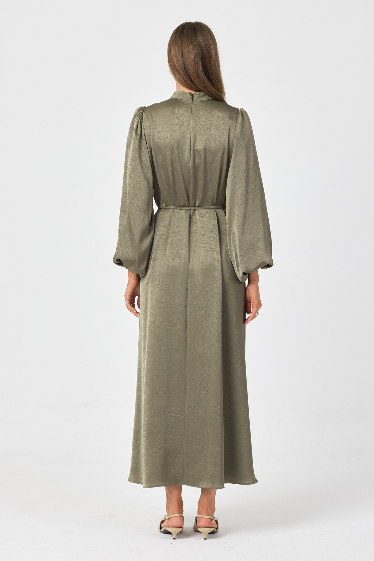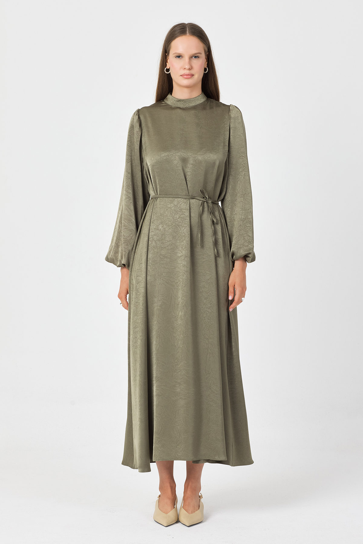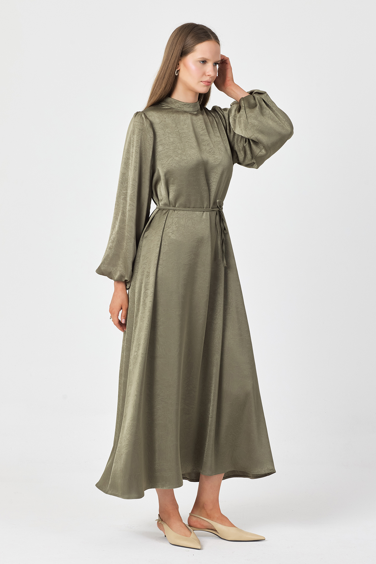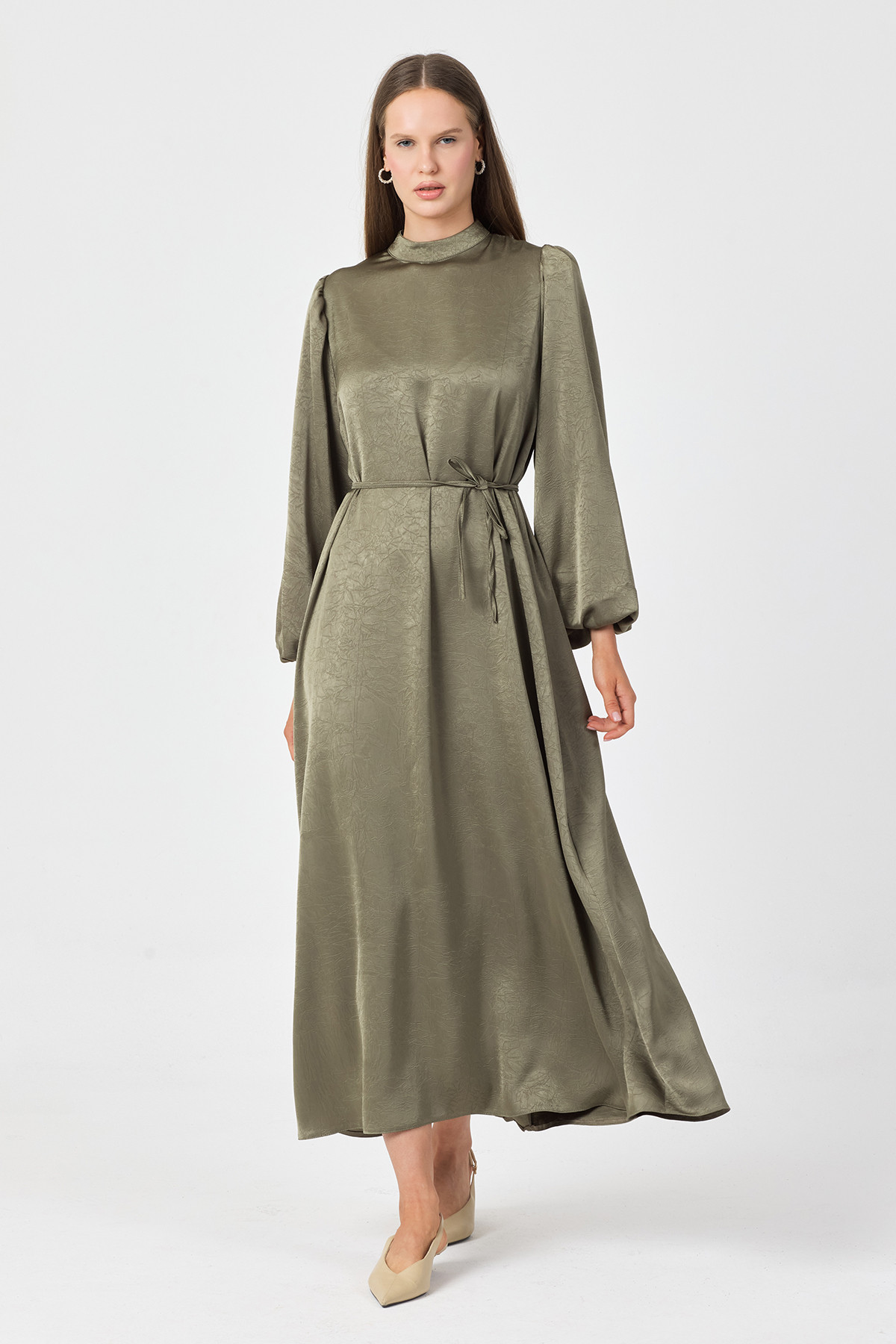 Dökümlü saten kraş kumaşı ve balon kollarıyla şıklık ve rahatlığı bir arada sunar. Seyyar bağcık kemer belinizi istediğiniz gibi şekillendirir, sırtından gizli fermuarlıdır.