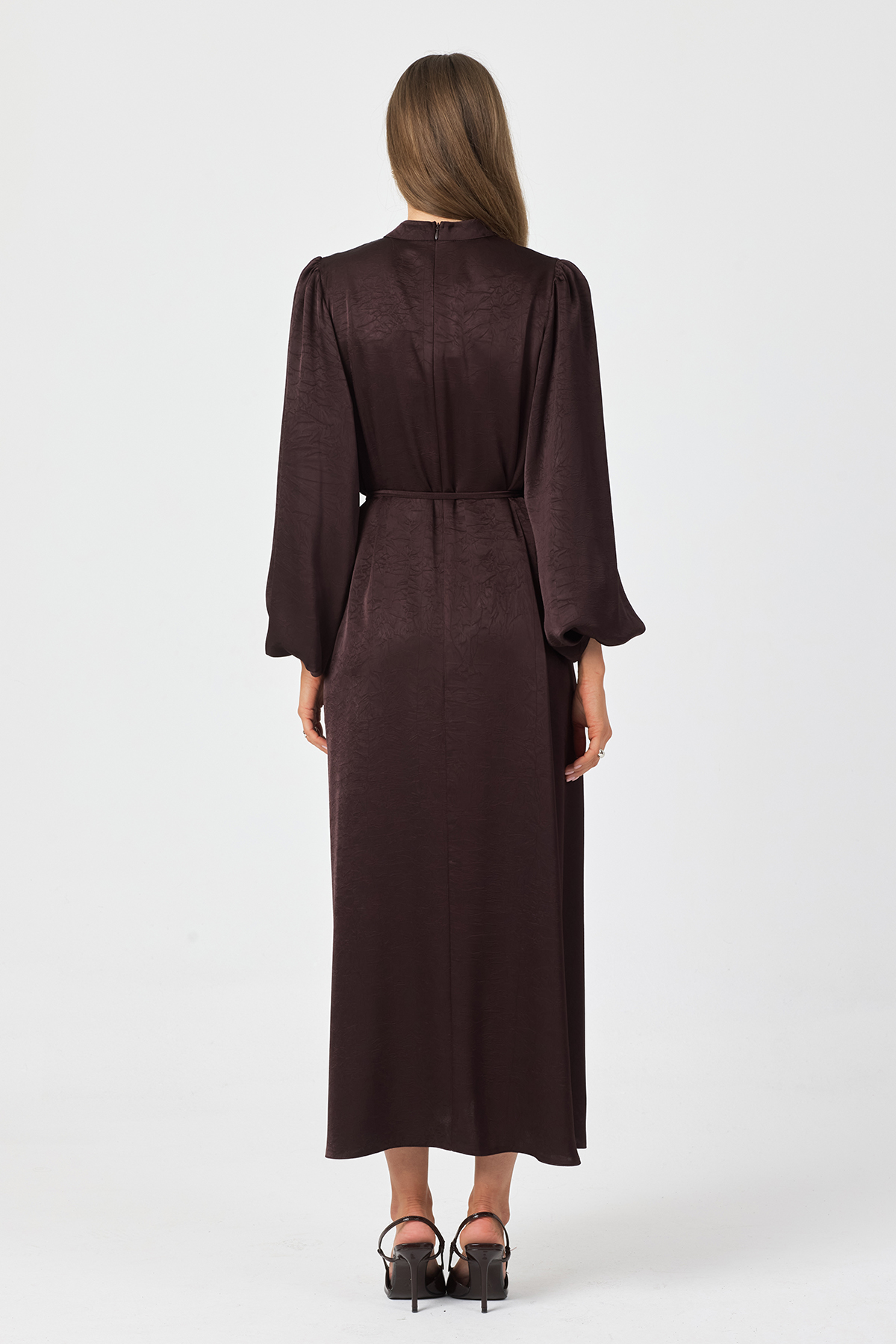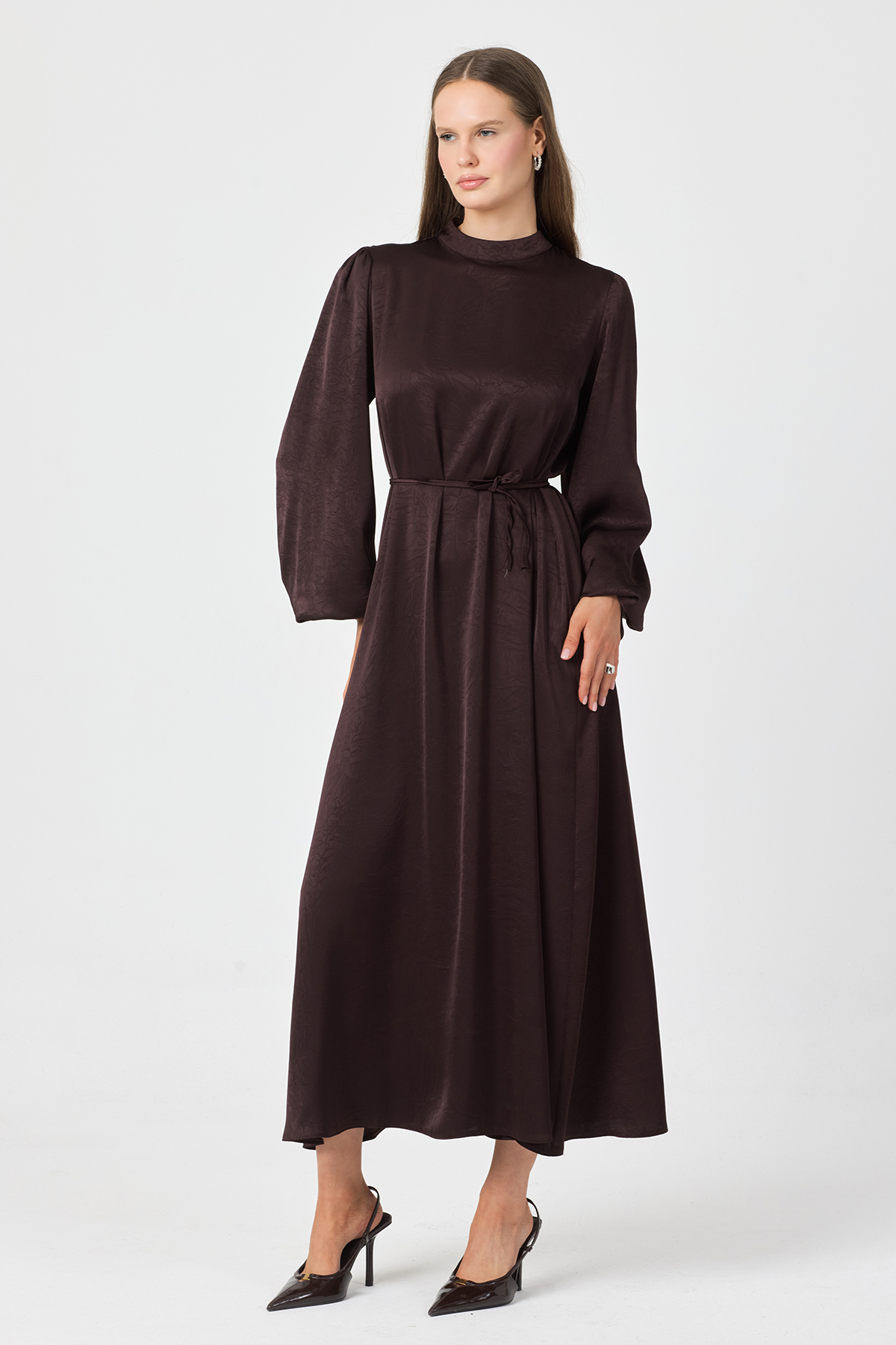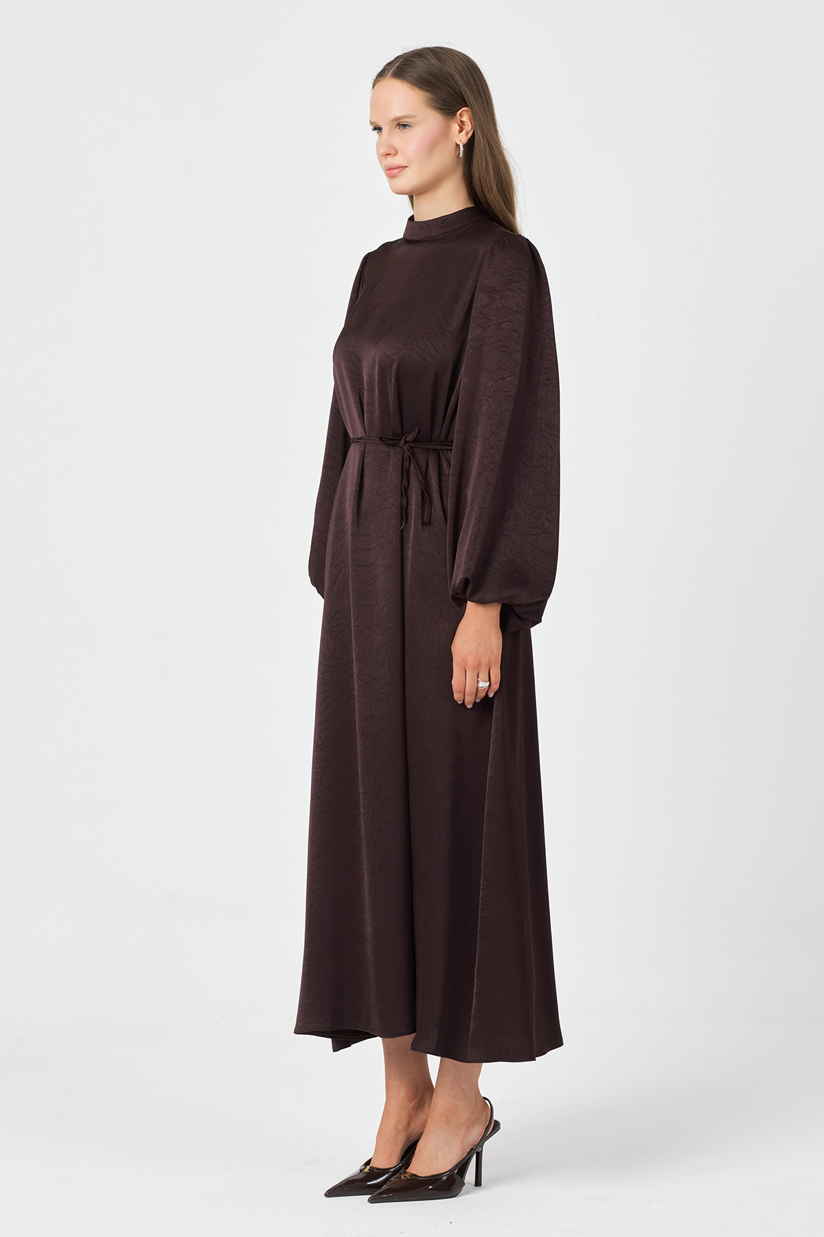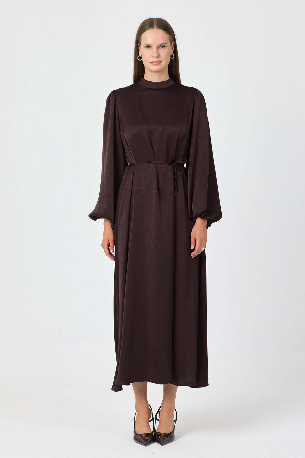 Dökümlü saten kraş kumaşı ve balon kollarıyla şıklık ve rahatlığı bir arada sunar. Seyyar bağcık kemer belinizi istediğiniz gibi şekillendirir, sırtından gizli fermuarlıdır.