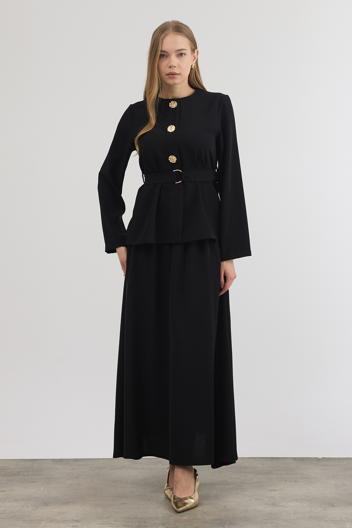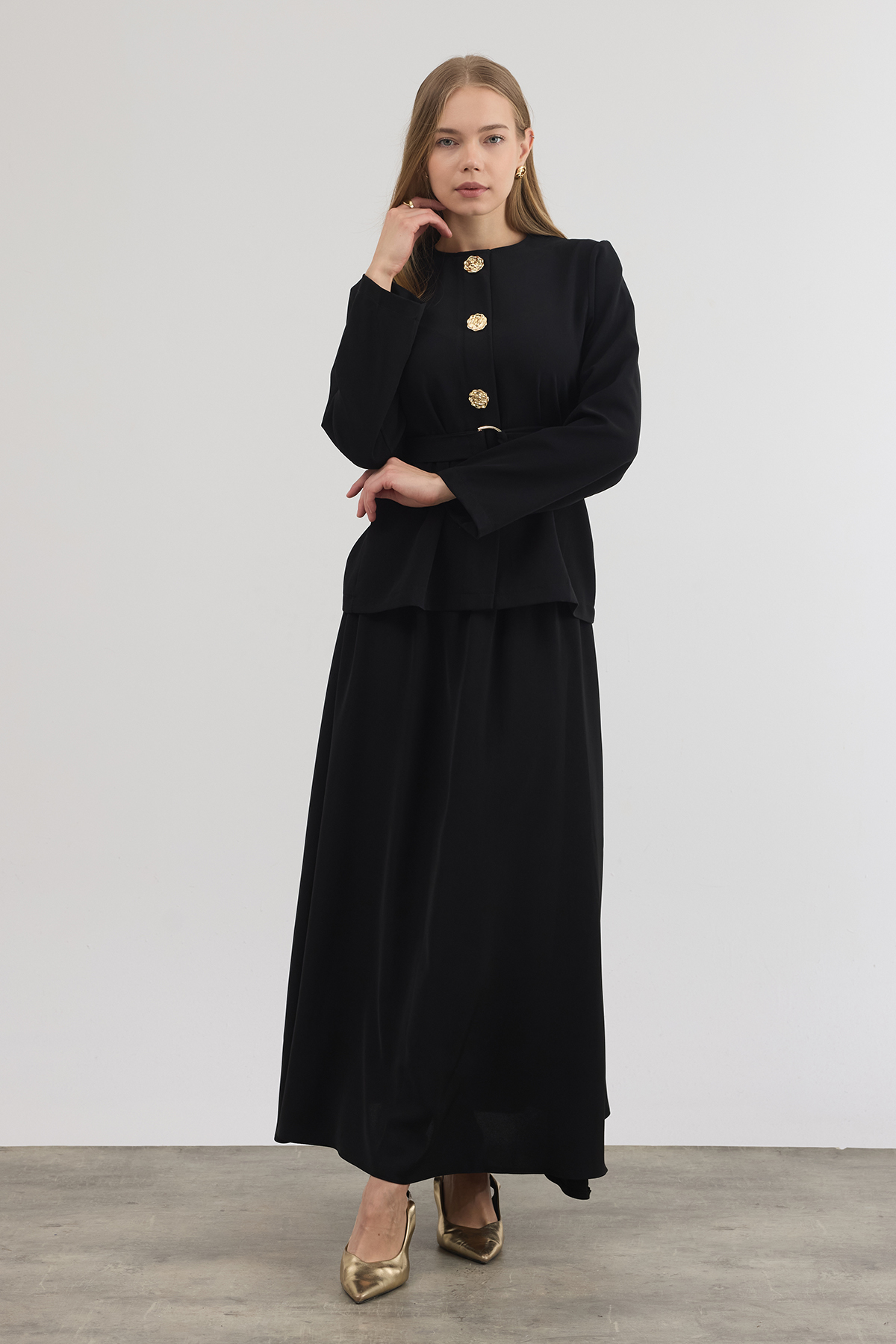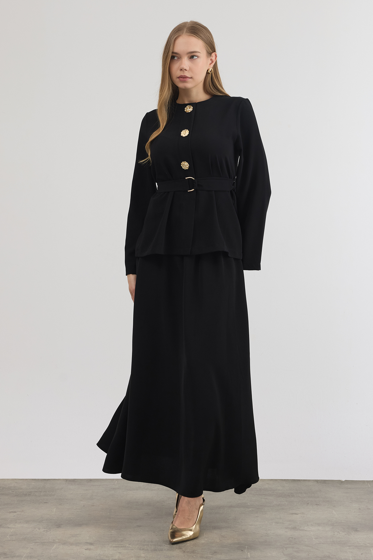 Gold Düğme Detaylı Etek Bluz Takım - Siyah