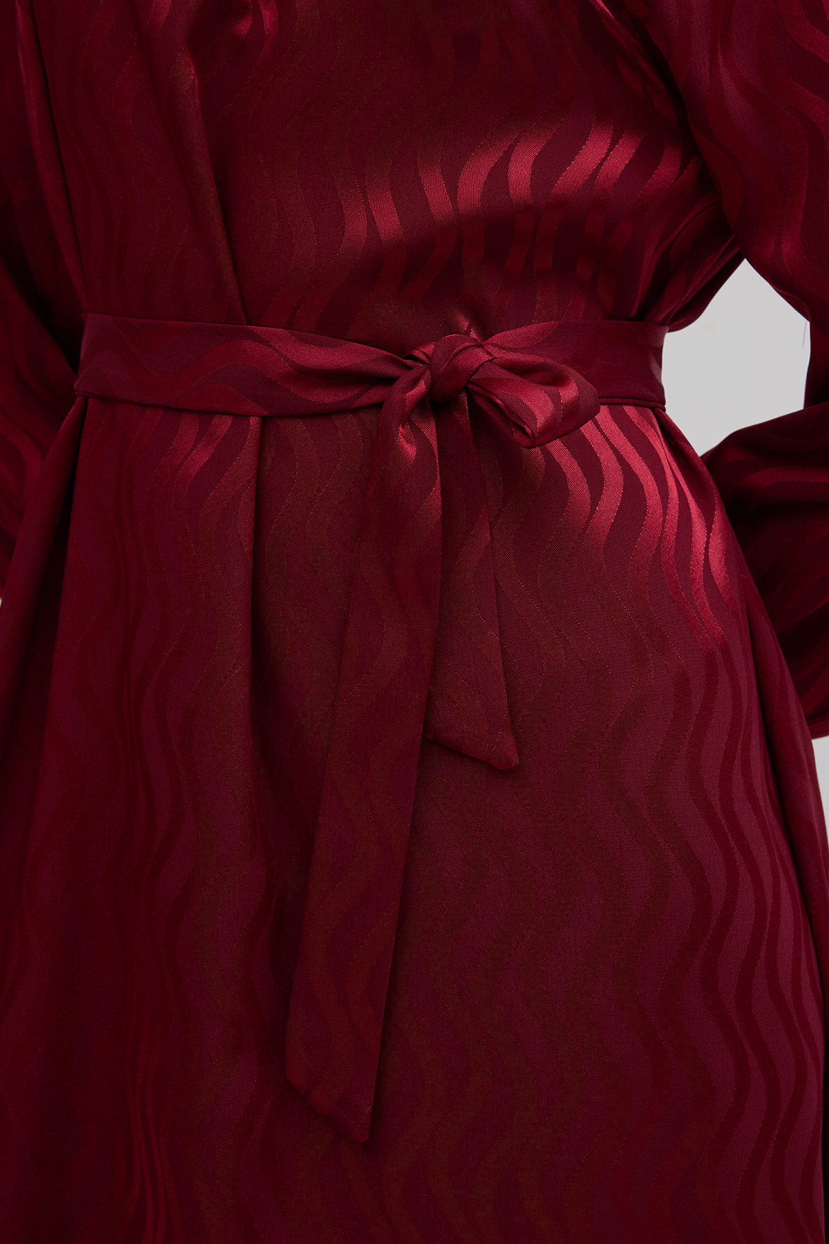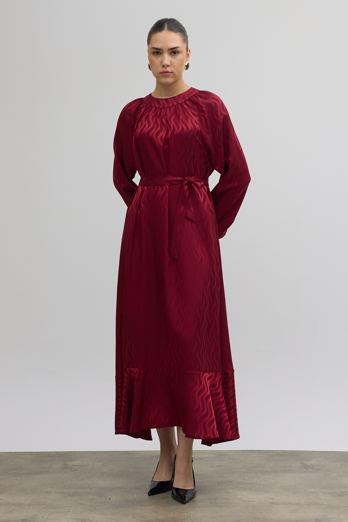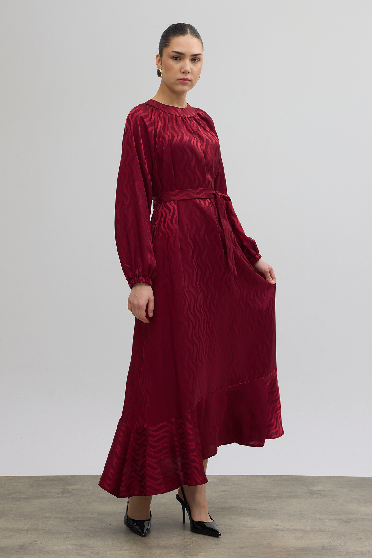 Kuşaklı Jakar Elbise - Bordo
