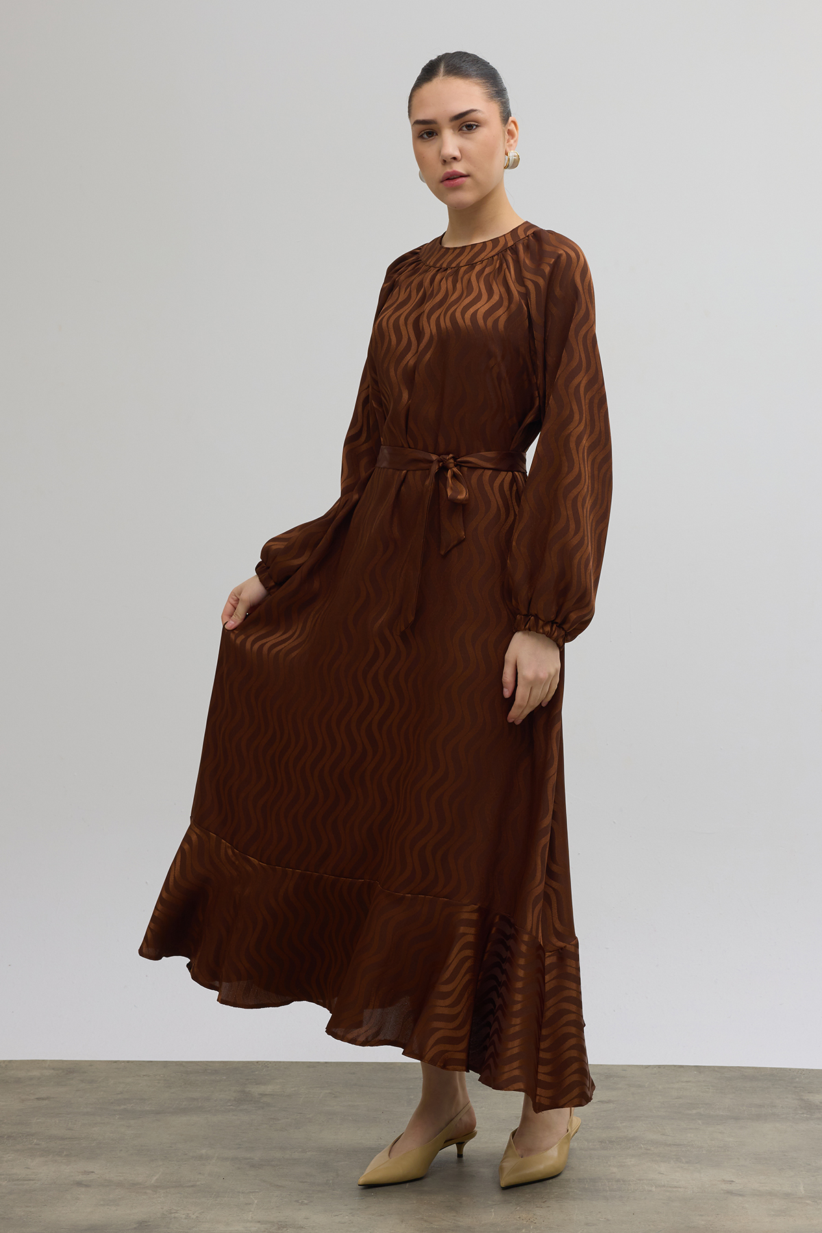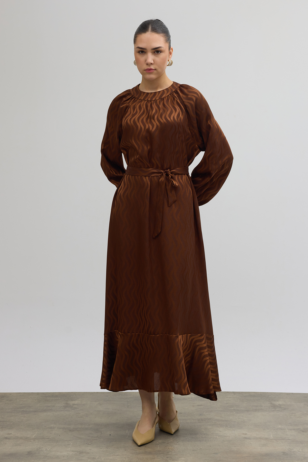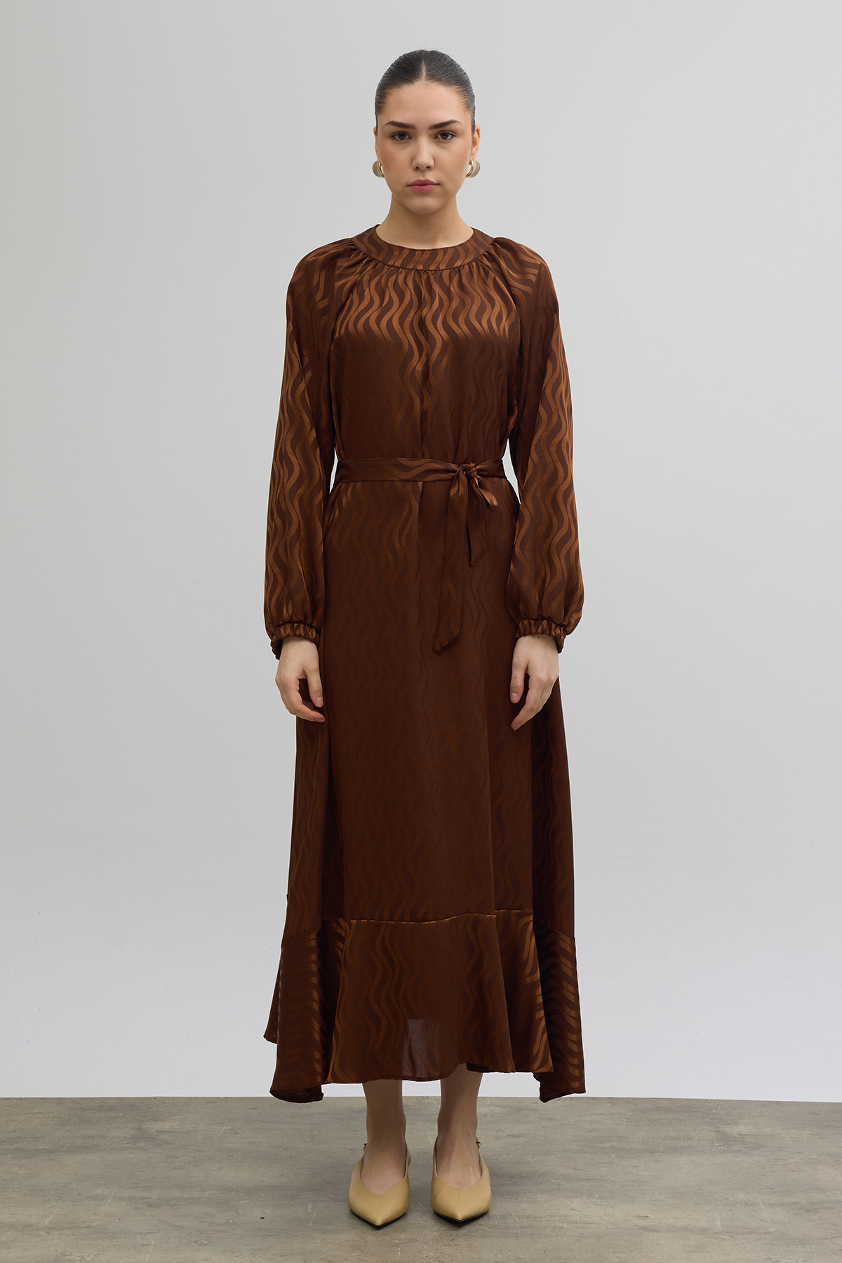Kuşaklı Jakar Elbise - Kahve