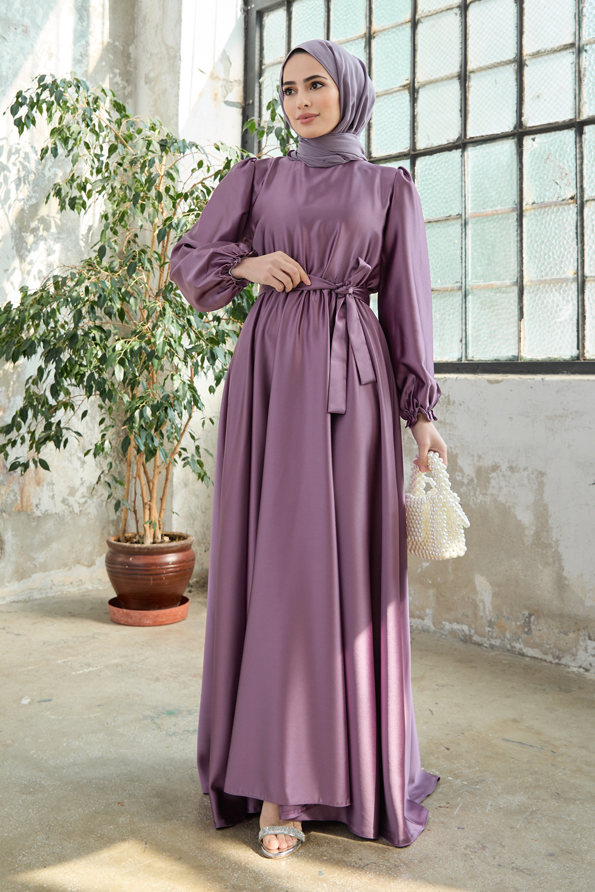Liza Kuşaklı Saten Elbise - Gül Kurusu