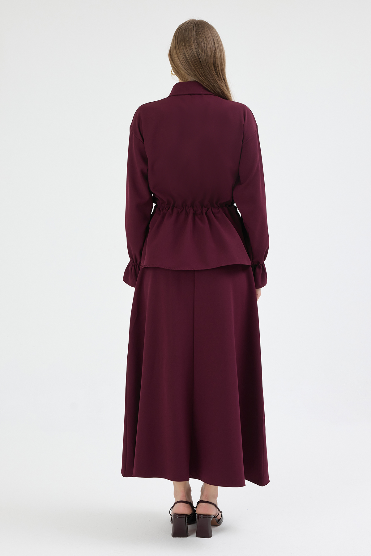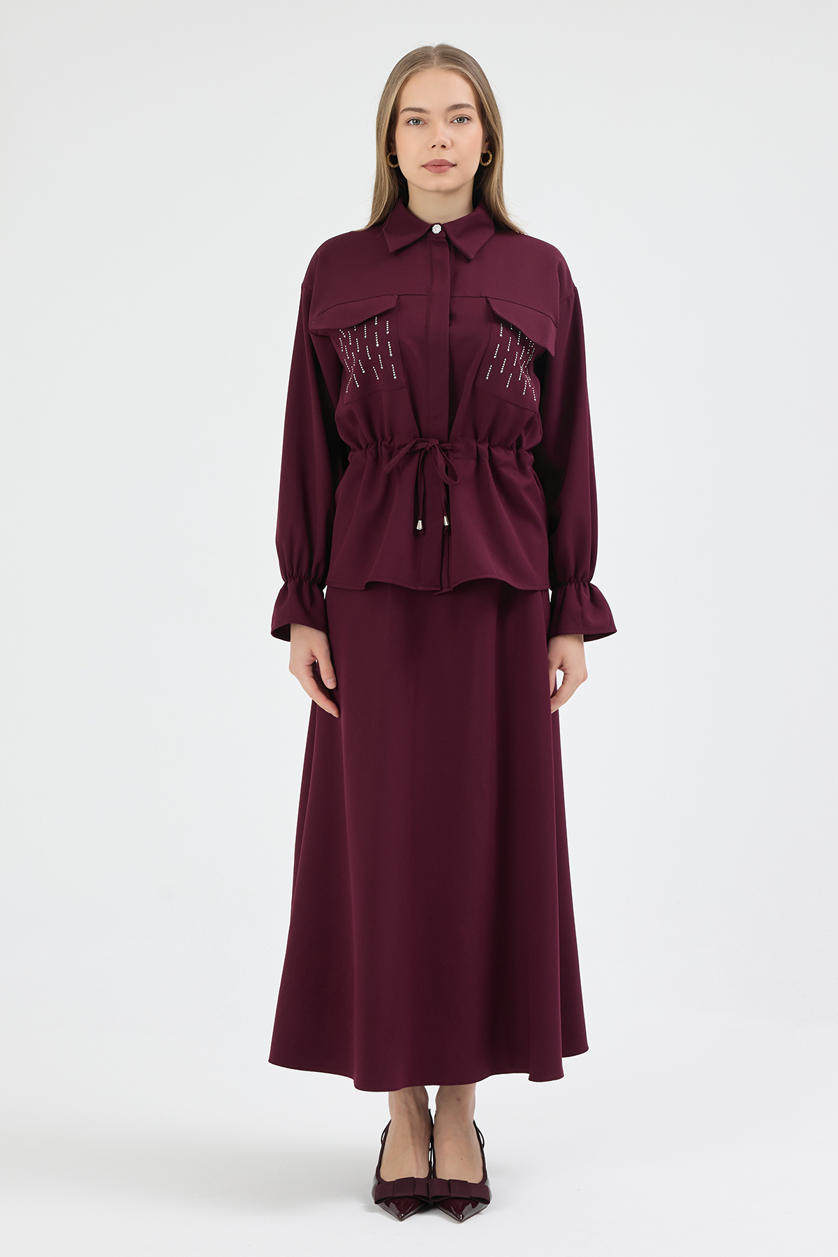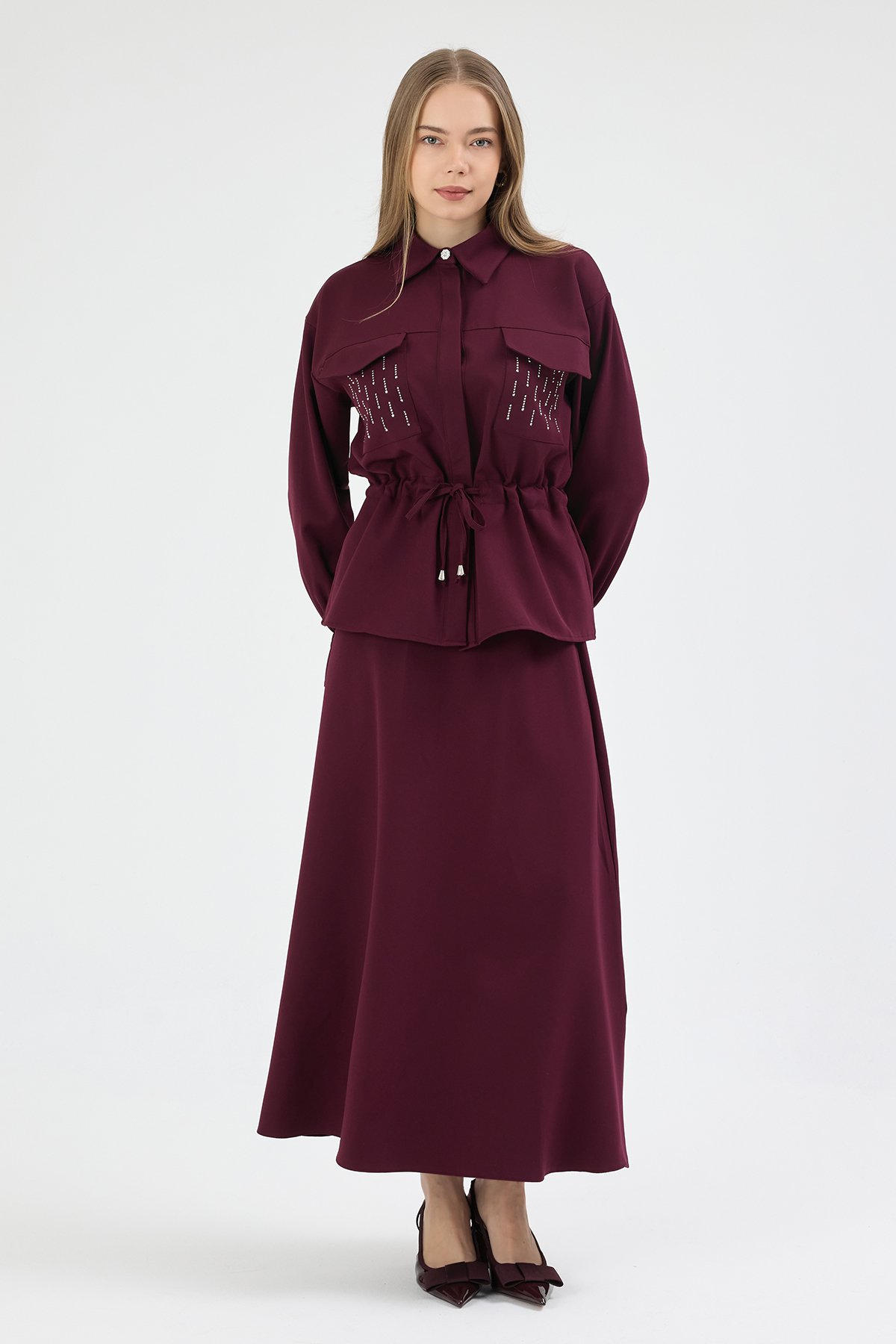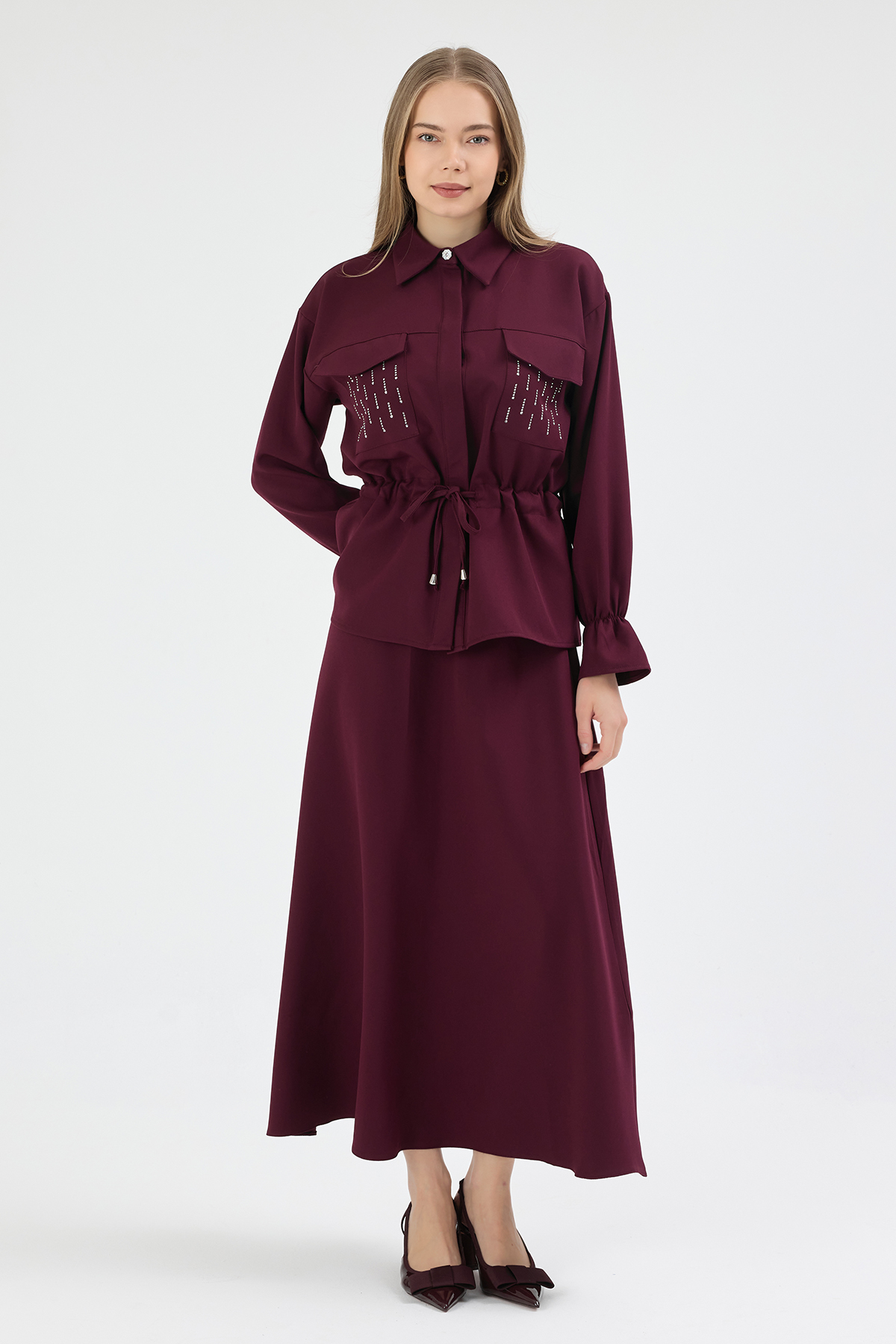Maya Beli Bağcıklı Etekli Takım - Mürdüm