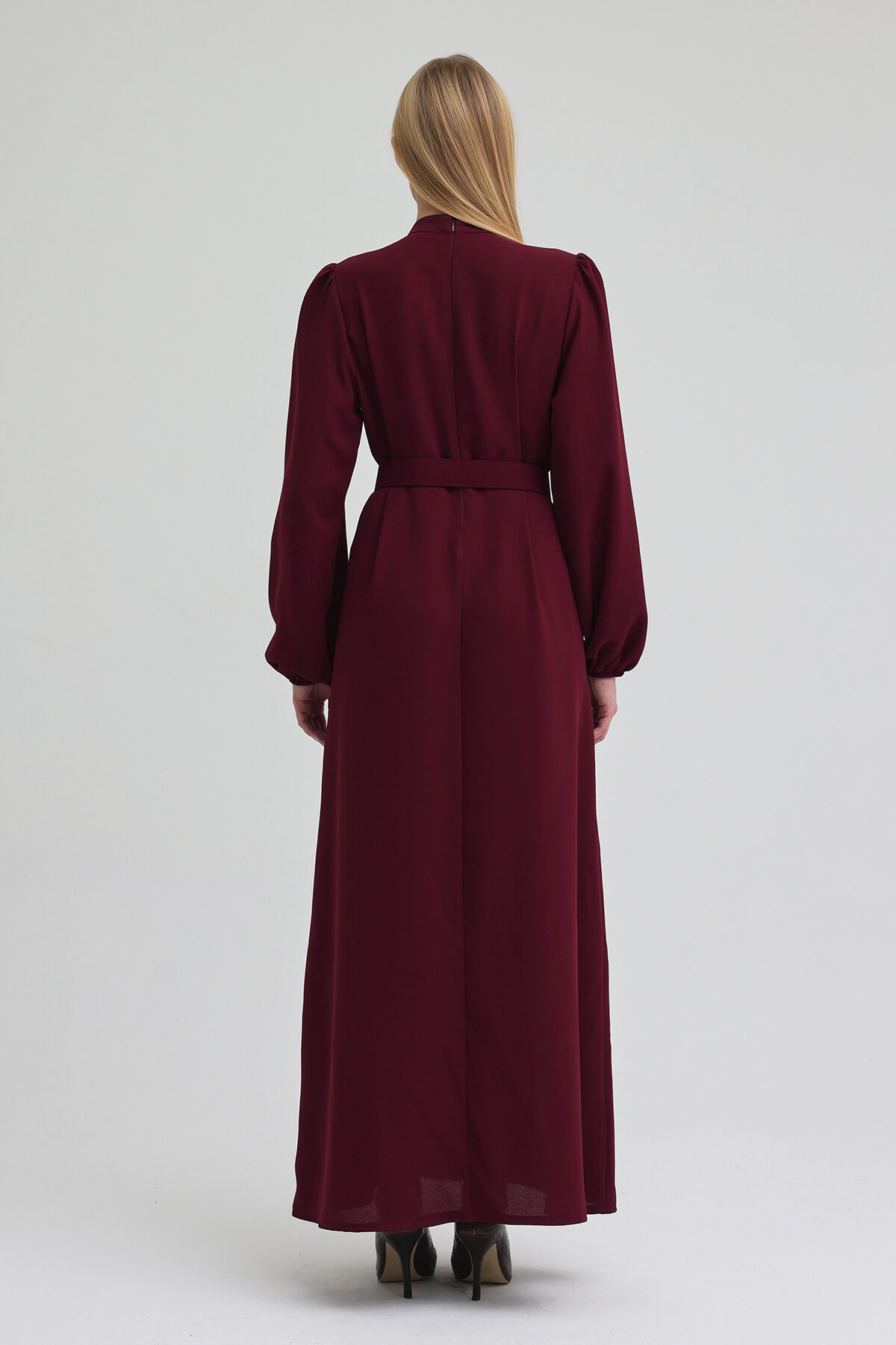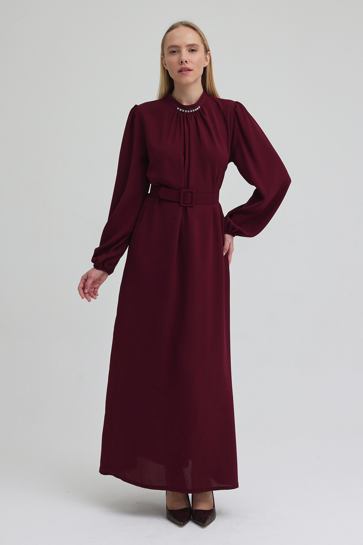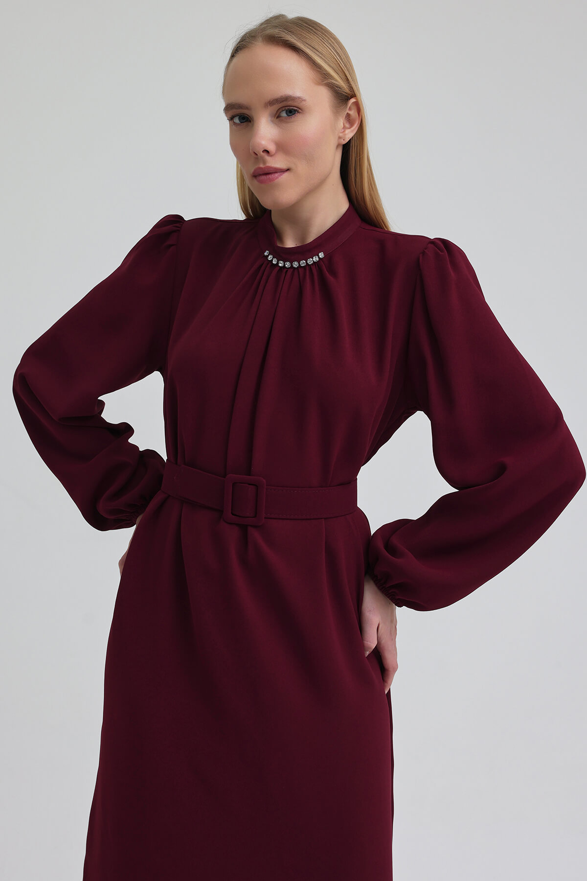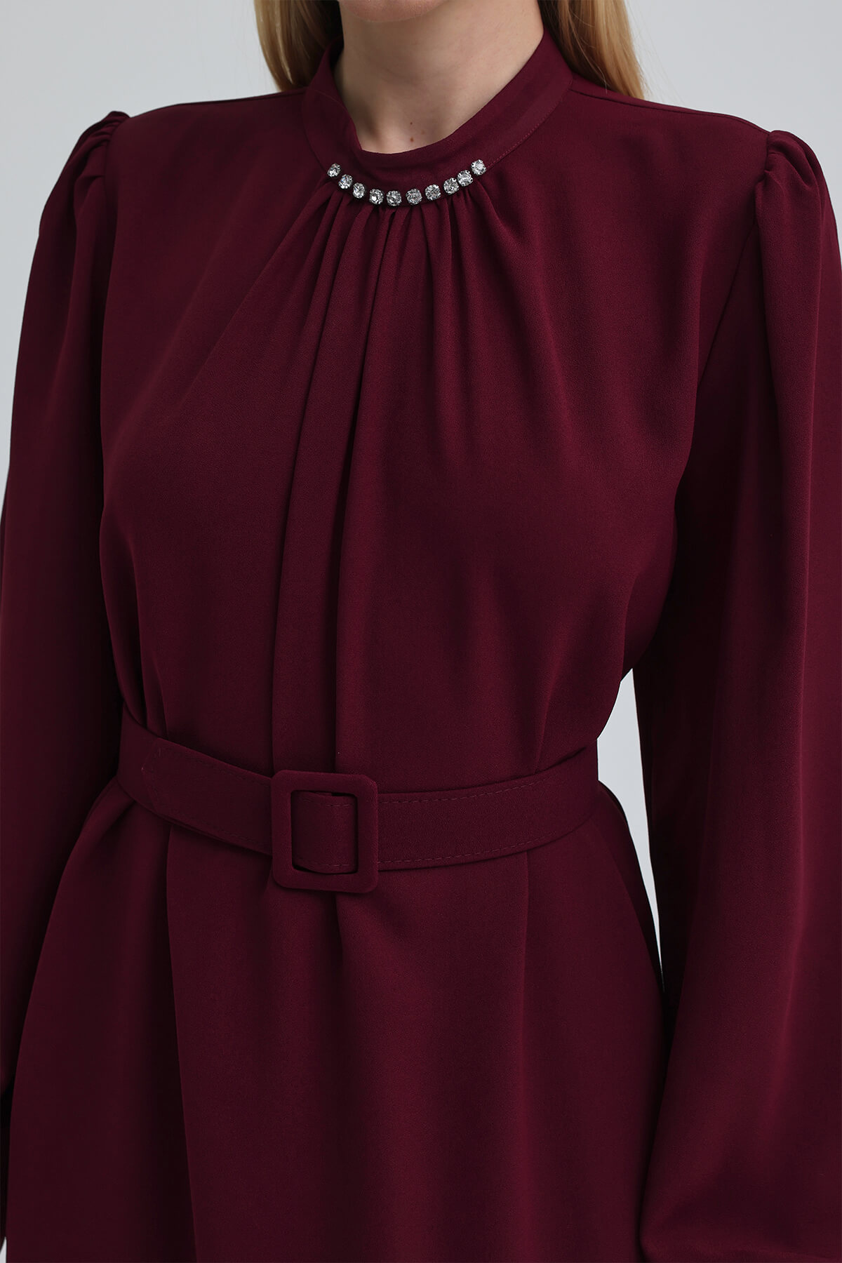 Yakası Taşlı Kemerli Elbise - Lacivert