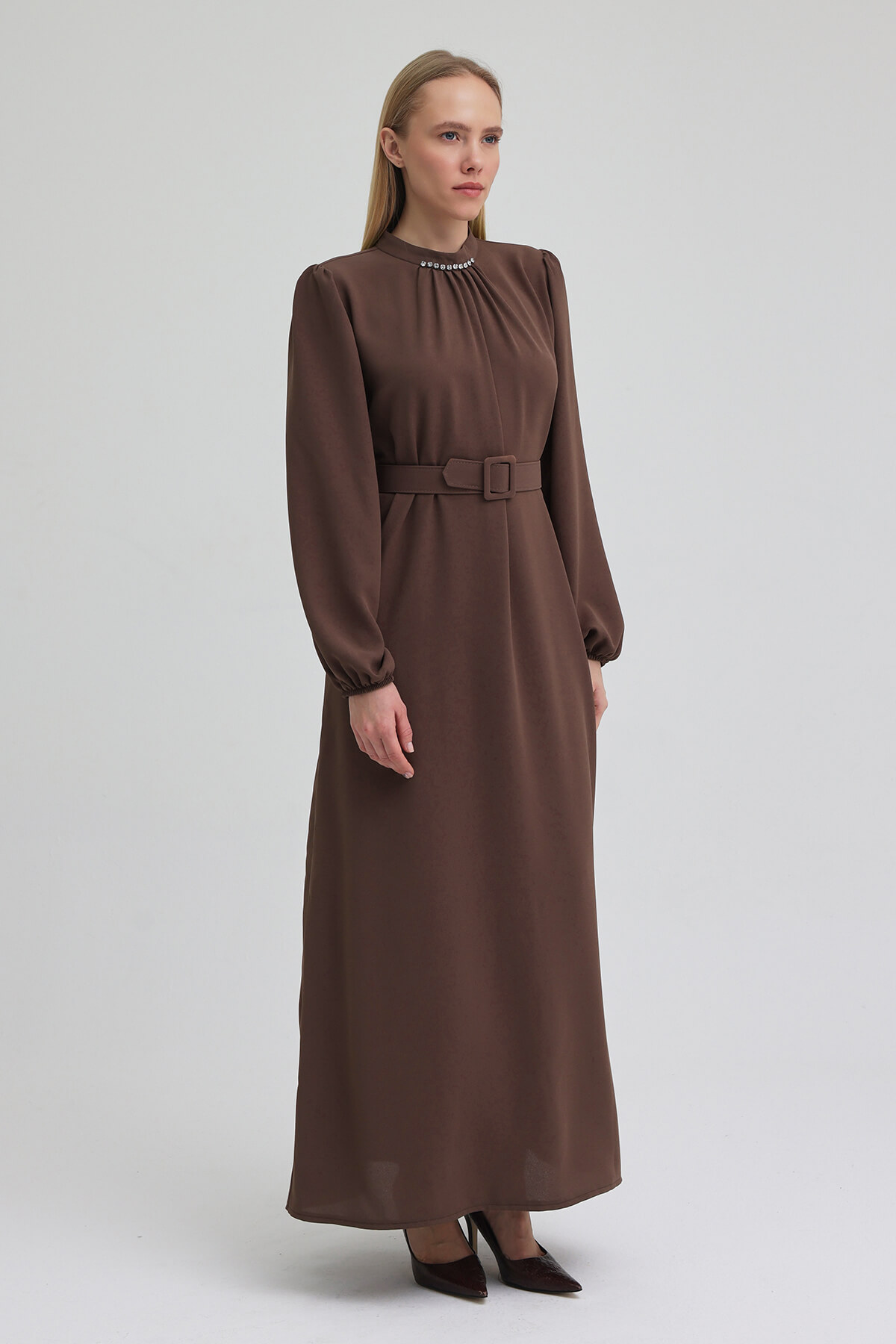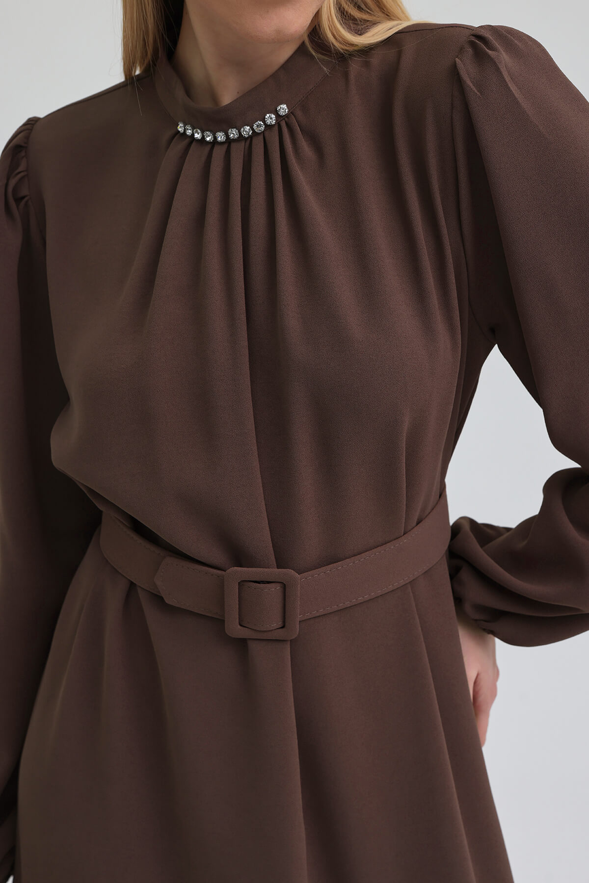 Yakası Taşlı Kemerli Elbise - Lacivert